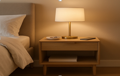If tops are compact, move the lamp to the wall: a pivoting sconce frees surface space for water and glasses. Prefer integrated solutions? A slim, warm LED under the top lip becomes a nightlight when you reach for the drawer, and a touch dimmer makes it usable at any hour. Keep colour temperature at 2700-3000K so faces (and pages) look kind. Lighting turns bedside tables into little stages bright enough to find your earbuds, gentle enough to keep the room sleepy.